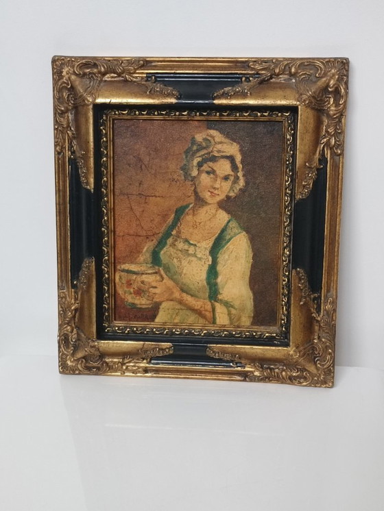 Olio figurativo su tela raffigurante una giovane donna con una ciotola in mano, firmato M. Capron in basso a sinistra.