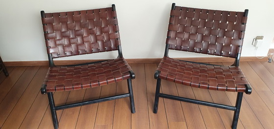 Coppia di poltrone in teak annerito con cinghie in cuoio naturale marrone scuro, esemplari eccezionali numero 1 e 2/240, modello Los Angeles, mai usate, conservate in laboratorio. Modello pubblicato da Ode's Design