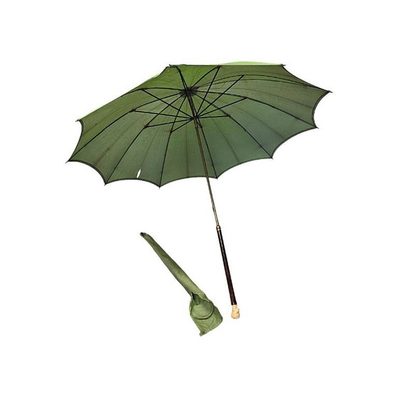 Ombrello antico con testa intagliata, risalente al 1900 circa. Questo grazioso e decorativo ombrello antico presenta un manico in legno massello e una testa intagliata a mano. Il tessuto verde è marchiato Rhotex e presenta alcuni danni.