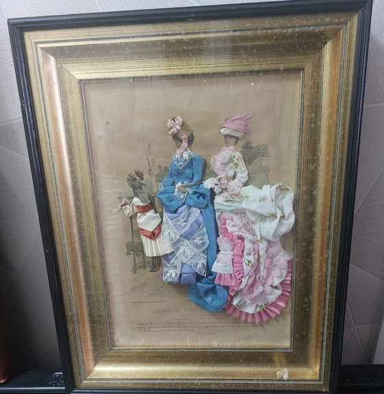 Questa splendida opera d'arte, con le sue raffinate applicazioni tessili, cattura l'eleganza di un'epoca passata. La raffigurazione dettagliata di donne in abiti classici, incorniciate da una cornice dorata e nera, la rende un pezzo straordinario per qualsiasi collezionista d'arte.