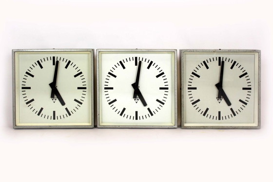 Set di tre orologi ferroviari quadrati realizzati da Pragotron nell'ex Cecoslovacchia. Il meccanismo dell'orologio è stato sostituito con uno nuovo, alimentato da una batteria AA.