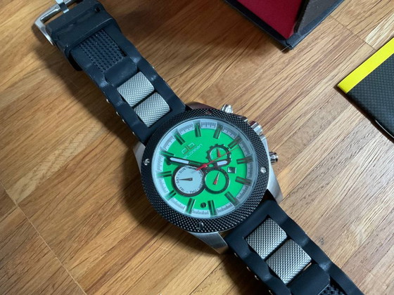 L'orologio colpisce per il suo design accattivante e sportivo, caratterizzato da un vivace quadrante verde e da una robusta cassa in acciaio inossidabile. Il preciso movimento automatico a 21 rubini garantisce un cronometraggio affidabile e può essere caricato anche manualmente tramite la corona.