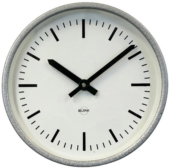 L'orologio da parete Burk è stato realizzato nella Germania Ovest negli anni '70. Presenta una struttura in ghisa grigia, un quadrante in metallo, lancette in alluminio e una copertura in vetro trasparente. L'orologio è stato convertito in un orologio a batteria e richiede solo una batteria AA. Il diametro dell'orologio è di 23 cm. Il peso dell'orologio è di 0,5 kg.