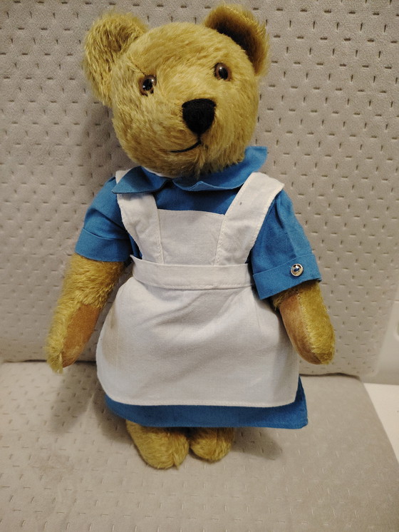 Questo orsacchiotto vintage Dallmayr è un grazioso oggetto da collezione, perfetto come elemento decorativo. L'orsetto presenta un design classico e indossa un abito blu con un grembiule bianco, che gli conferisce un aspetto nostalgico. La lavorazione di alta qualità e la cura dei dettagli lo rendono un pezzo speciale per collezionisti e amanti dei giocattoli d'epoca. Un vero e proprio colpo d'occhio, questo orsacchiotto da collezione è realizzato a mano in esclusiva per Dallmayr in Germania. La sua pelliccia è realizzata in pregiato peluche mohair color mais. Alto circa 32 cm. Ottime condizioni d'uso. Vendita privata. Nessun reso.