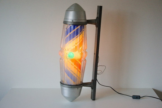 Vi presentiamo un raro e perfettamente funzionante lampione pubblicitario giapponese d'epoca, probabilmente prodotto dalla Osaka Sign Co. Ltd negli anni '50 o '60. Questo pezzo da parete è dotato di un tubo interno rotante azionato da un motore che emette un leggero ronzio. L'elegante esterno in alluminio, il tubo esterno in vetro dalla forma insolita e il design futuristico lo rendono un'aggiunta di spicco a qualsiasi collezione o arredamento. Recentemente ricablato con un nuovo cavo con spina UE e interruttore per un funzionamento sicuro. Ideale per collezionisti, amanti del retrò o come elemento di illuminazione unico.