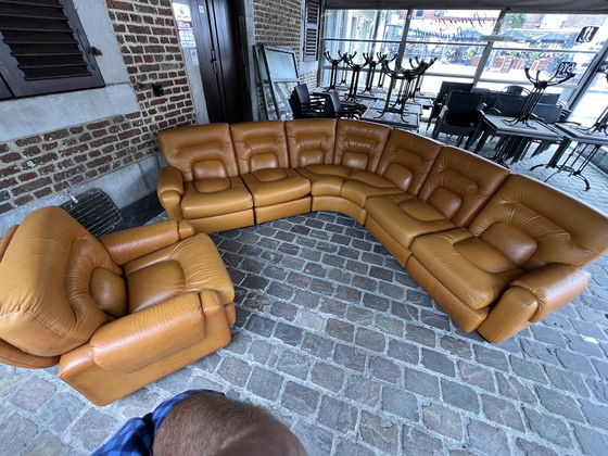 Questo è un set di divani in pelle vintage di Poltrona Italia degli anni '70, con un design classico che incarna lo stile dell'epoca. Il set è composto da uno spazioso divano letto e da una poltrona abbinata, entrambi rivestiti in ricca pelle marrone. La pelle è in ottime condizioni e mostra la maestria del design italiano. Il design modulare del divano consente una disposizione flessibile per adattarsi al vostro spazio. Questo mobile è perfetto per chi cerca un tocco di eleganza retrò in salotto.