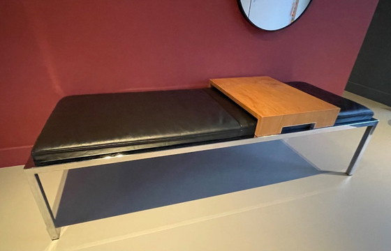 Un classico del design di Harvink: una panca rivestita in pelle nera, con base in metallo e piattaforma in legno rimovibile.