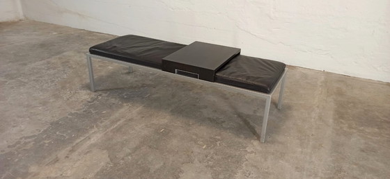 Panca vintage anni '80 in pelle nera con tavolo in legno abbinato e struttura in metallo.
