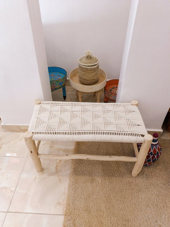 Scoprite il fascino dell'artigianato marocchino con questa squisita panca realizzata a mano. Con le sue dimensioni di 110 cm x 40 cm, questo pezzo è una testimonianza dell'arte tradizionale, caratterizzato da una seduta in tessuto finemente intrecciato che si integra perfettamente con la robusta struttura in legno. Perfetta per aggiungere un tocco di eleganza a qualsiasi ambiente, questa panca offre funzionalità e stile.