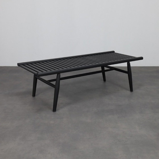 Il design è definito dalla sua silhouette allungata e dalle doghe in legno distanziate uniformemente, che creano una superficie ritmica che appare leggera e al tempo stesso solida. Le gambe leggermente angolate e la chiara logica strutturale conferiscono alla panca una presenza scultorea, pur mantenendo un carattere sobrio e funzionale. Rifinito in una tonalità scura e profonda, il legno enfatizza la composizione lineare e ne esalta l'eleganza discreta e contemporanea. Adatto come seduta, tavolino basso o elemento architettonico di spicco, questo pezzo si integra perfettamente sia in interni minimalisti che di design.