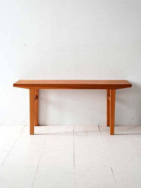 Panca scandinava degli anni '60 realizzata in pino massello, caratterizzata da un piano a doghe parallele che alleggerisce la struttura e aggiunge un tocco distintivo. Il design lineare, sostenuto da gambe quadrate collegate da traverse, riflette la semplicità e la funzionalità del modernismo nordico.