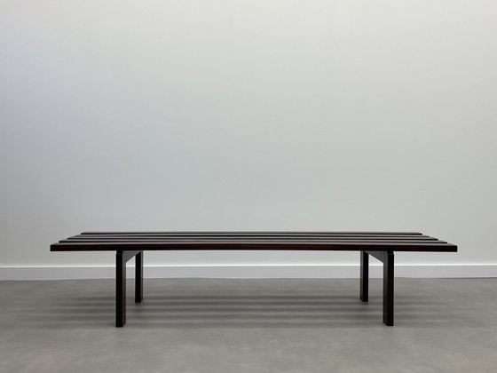 Questa robusta panca in legno massello ha 5 doghe ed è in buone condizioni, con minimi segni di usura.