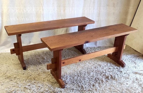 So Déco! Coppia di panche in legno massello (pino) in stile scandinavo. Adatte per 2 adulti o 3 bambini, troveranno il loro posto in cucina o nell'ingresso. Robuste, pulite e stabili, in ottime condizioni. Altezza: 47 cm Larghezza: 110 cm Profondità: 30 cm Altezza seduta: 25 cm Peso: +/- 10 kg