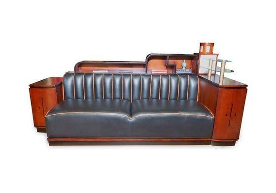 Unite eleganza e funzionalità con l'esclusivo divano Art Déco "Anna". Questo divano magistralmente realizzato combina il comfort di materiali di alta qualità con la raffinatezza del design degli anni '30, rifinito in calde tonalità di legno con accenti neri.