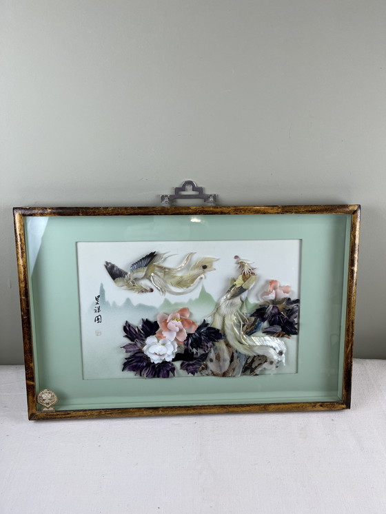 Elegante pannello decorativo asiatico in madreperla e conchiglie, raffigurante uccelli in volo tra peonie delicatamente intagliate a rilievo.