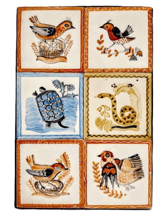 Vi presentiamo un bellissimo pannello composto da sei piastrelle in ceramica maiolica dipinte a mano. Su ciascuna piastrella è raffigurato un animale o un uccello. Le piastrelle sono disposte su tre file da due. I lati sono rivestiti da una cornice in rame e il retro è in legno. È presente anche un gancio per appenderle. Lo userei come decorazione per qualsiasi parete. Si tratta di un pezzo davvero unico.