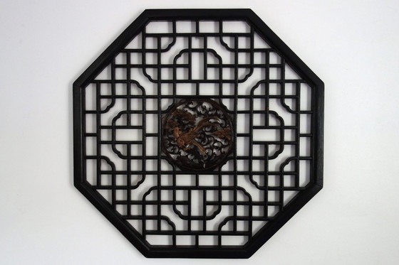 Raro pannello murale ottagonale in legno intagliato proveniente dalla Cina, prima metà del XX secolo.