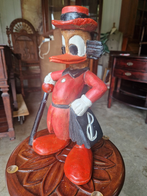 Aggiungi un tocco di nostalgia ai tuoi interni con questa splendida statua in legno di Paperone. Questo pezzo vintage, con i suoi vivaci colori rosso e nero, rende omaggio a un personaggio iconico e rappresenta un'aggiunta affascinante a qualsiasi stanza.