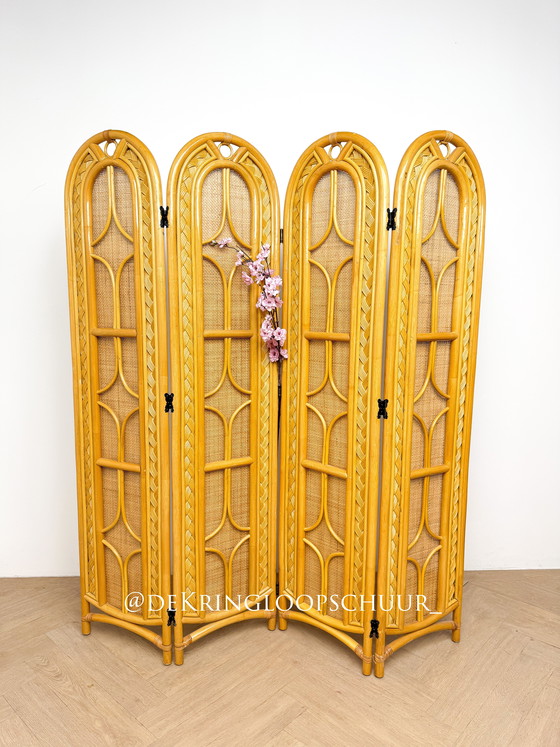 Paravento vintage in rattan e bambù per dividere la stanza.