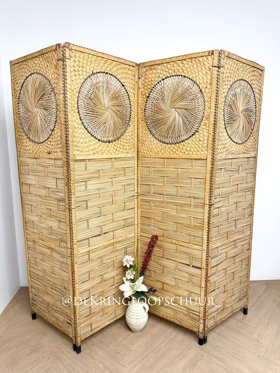 IN VENDITA Ecco un altro pezzo, e che pezzo! Un bellissimo divisorio in rattan a quattro pannelli (!) ❤️ Ammirate i bellissimi dettagli intrecciati intorno al motivo a raggiera e alla parte inferiore del divisorio. Una vera opera d'arte.