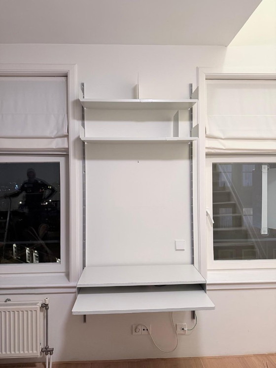 Con due ripiani (+ 2 fermalibri) e un elemento scrivania.