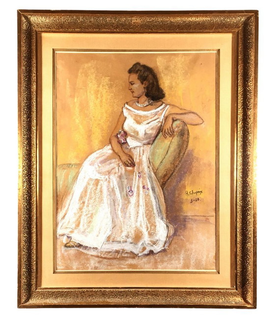 Élégant pastel original signé du peintre belge Louis-Marie-René Choprix, artiste reconnu pour ses figures féminines raffinées et son style sensible, emblématique de l’art figuratif belge du milieu du XXᵉ siècle.