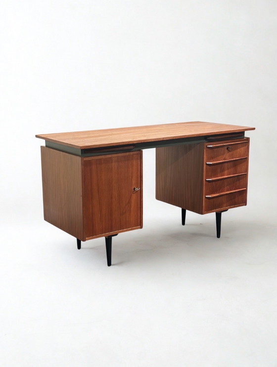 Scrivania minimalista olandese, disegnata da Cees Braakman per Pastoe, risalente agli anni '50-'60. Realizzata in teak impiallacciato, presenta un mobiletto con anta, quattro cassetti e due ripiani estraibili per una maggiore funzionalità. Le sottili gambe nere conferiscono alla scrivania un aspetto leggero e architettonico.
