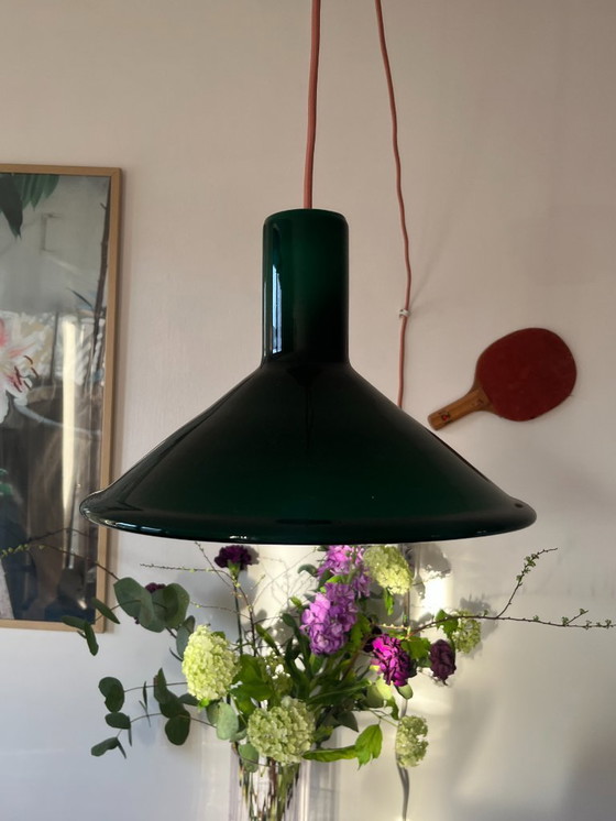 Lampada a sospensione Holmegaard P&T, progettata nel 1972. Vetro opalino soffiato a bocca di alta qualità, spesso, di un bel verde scuro all'esterno e bianco all'interno. Il portalampada è originale, il cavo è stato sostituito con un cavo in tessuto rosa chiaro. La lampada è perfettamente funzionante – vedi ultima foto.