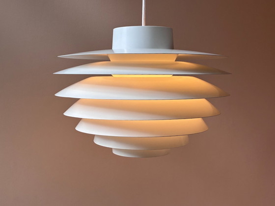 Vendo lampada a sospensione Verona di Sven Middelboe nella versione con 7 paralumi Design: Sven Middelboe Produttore: Nordisk Solar, Danimarca Modello: Lampada a sospensione Verona con attacco in porcellana 1xE27 max. 100 watt Dimensioni: Diametro 40 cm, altezza 28 cm, con cavo tessile bianco 180 cm Colore: Bianco all'esterno, bianco all'interno e ultimo riflettore grigio all'interno Materiale: Metallo (alluminio) Condizioni: Con normali segni di usura, piccoli bordi smussati, leggermente ondulato Vendita escluse le lampadine Condizioni: Ottime condizioni, vedi foto Prezzo per 1 lampada Verona, altre disponibili!