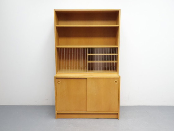 Il mobile superiore ha due ante scorrevoli in vetro con motivo a righe.