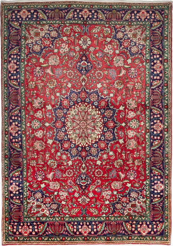 Questi tappeti sono annodati nei laboratori della città di Tabriz, nella Persia nord-occidentale. Un tappeto robusto e resistente, con vello corto e ruvido. Il motivo è costituito da un medaglione circondato da arabeschi, salici piangenti e cipressi. Dimensioni Tabriz: 278 x 204 cm. Circa 250.000 nodi al mq.