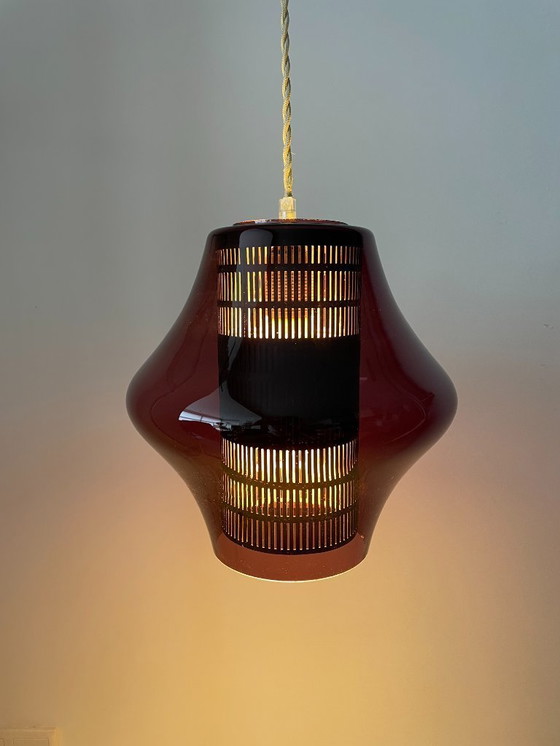Modello molto raro. La lampada è in vetro rosso bordeaux con un cilindro nero in acciaio nella lampada stessa dotato di lamelle attraverso le quali cade la luce.