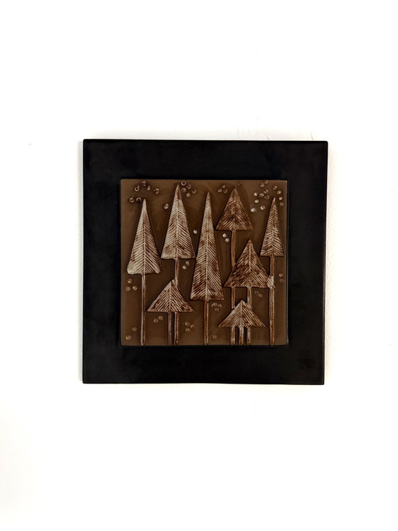 Splendida piastrella decorativa a rilievo degli anni '70. Gres marrone, prodotta nella Germania occidentale. Bellissimo motivo di pini nella neve. In ottime condizioni.