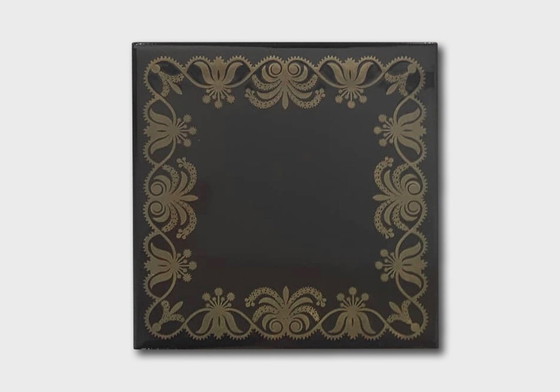 Sfondo nero con decalcomania marrone chiaro, smaltate lucide.