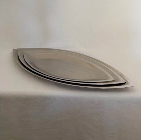 Questo set include tre piatti da portata in acciaio inossidabile 18/10 della serie Cosmos di Guy Degrenne, prodotti negli anni '70. Le dimensioni sono: 55 × 24,5 cm, 49 × 22,5 cm e 41 × 20 cm. Ogni pezzo ha un aspetto pesante e solido e mostra lievi segni del tempo, compatibili con il normale utilizzo. Un set resistente e senza tempo, ideale per servire, esporre o aggiungere un tocco di design francese vintage alla tua tavola.