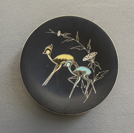 Questo squisito piatto da parete in ceramica Ruscha degli anni '60 presenta un affascinante motivo a cervo, che cattura l'essenza del design moderno di metà secolo. Lo sfondo nero del piatto contrasta splendidamente con le delicate figure gialle e blu dei cervi, creando un effetto visivo di grande impatto.