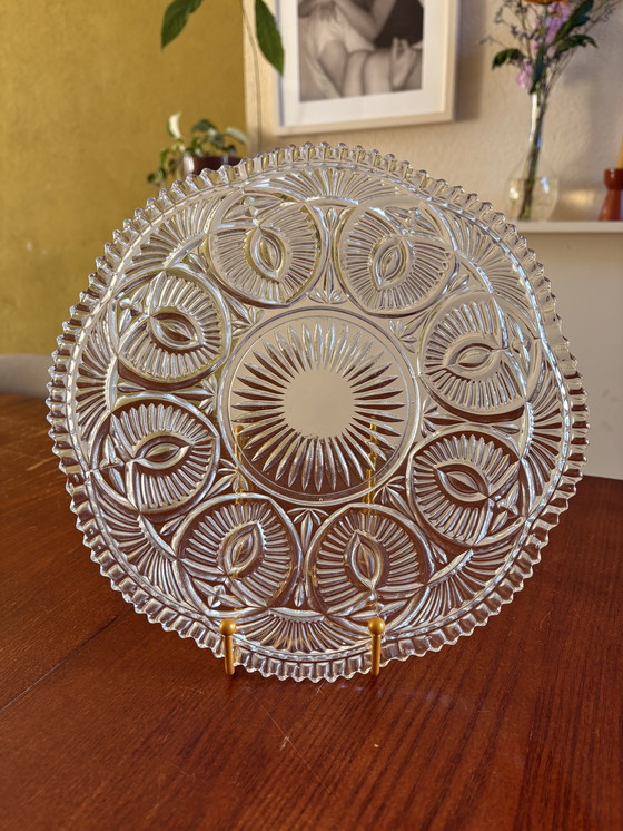 Piatto in vetro pressato vintage - 28 cm Bellissimo piatto in vetro vintage con un dettagliato motivo in rilievo. Questo piatto (⌀ 28 cm) è realizzato in vetro pressato trasparente e presenta un elegante motivo a raggiera e floreale, perfetto per una tavola retrò o classica. ✨Caratteristiche: ✔ Diametro: 28 cm ✔ Realizzato in robusto vetro pressato ✔ Design in rilievo dettagliato, probabilmente degli anni '20-'50 ✔ Perfetto come piatto da portata per dolci, snack o come elemento decorativo Il piatto è in splendide condizioni vintage. Un'elegante aggiunta all'arredamento della tua casa o alla decorazione della tavola!