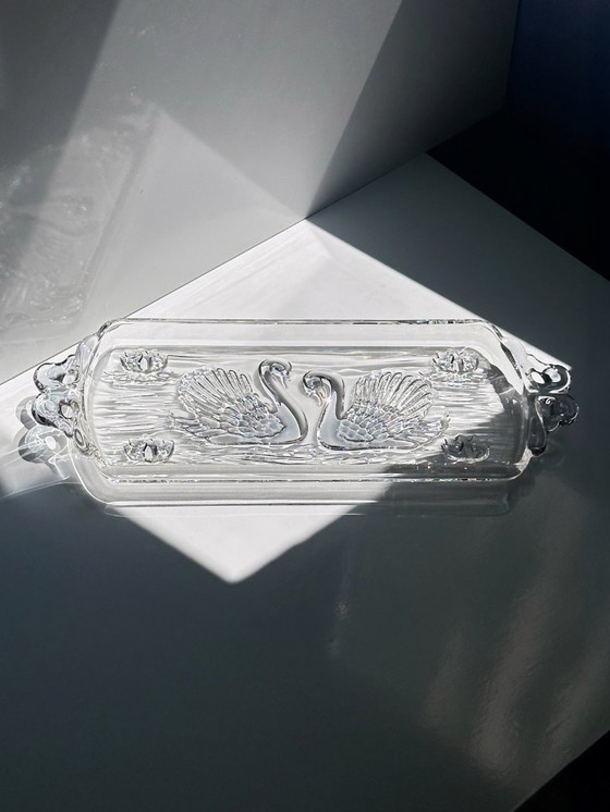 Piatto da torta in vetro vintage Art Deco Revival swan 80s Walther in vetro cristallo