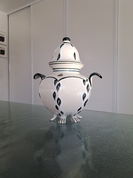 Grazioso vaso con coperchio in stile art déco, decorato con una bella smaltatura mista bianca e nera e decorazioni dipinte a mano. È realizzato in plateel. Il plateel è un particolare tipo di ceramica. Il decoro o il motivo viene dipinto a mano sul plateel da un cosiddetto pittore di plateel prima della seconda cottura.