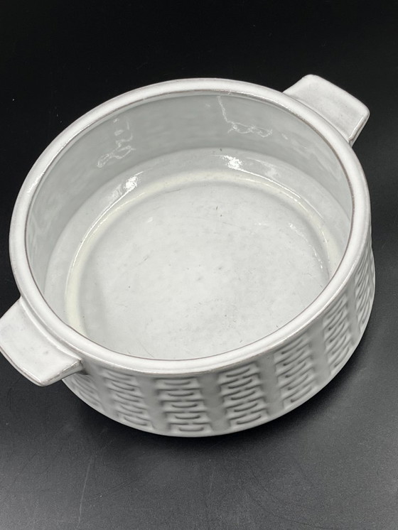 Scopri questo piatto da portata Epsilon di Céramano di Karl Leutner, un pezzo eccezionale che incarna l'eleganza senza tempo del design Mid-Century Modern. Questo piatto da portata in ceramica marrone e bianca, con i suoi delicati motivi e i manici integrati, è un perfetto esempio della raffinata artigianalità e dello stile distintivo di Céramano.