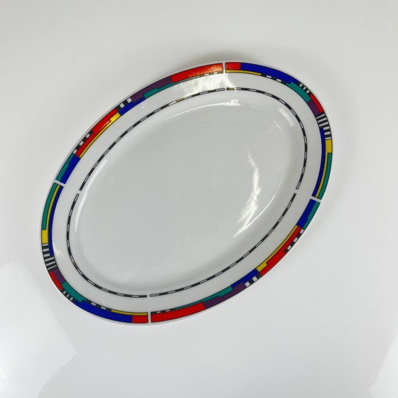 Piatto ovale in porcellana Van Well con bordo geometrico multicolore, 1980
