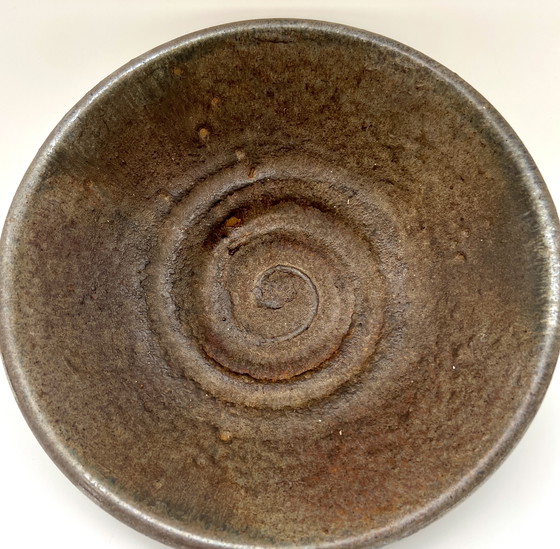 In vendita un pezzo di ceramica (piatto/ciotola) tornito a mano con una caratteristica smaltatura terrosa nei toni del marrone e dell'oliva. La superficie presenta una texture naturale e un motivo a spirale all'interno, che ne indica chiaramente l'origine artigianale.