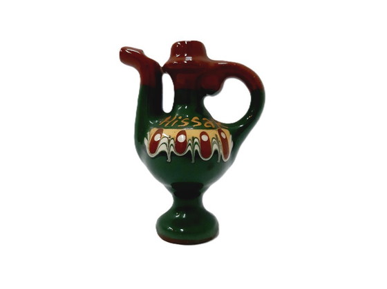 Questa deliziosa brocca decorativa vintage in ceramica, impreziosita da un fischietto, è un'aggiunta affascinante a qualsiasi collezione. Le sue intense tonalità di verde e marrone, impreziosite da intricati dettagli bianchi, evocano un senso di eleganza senza tempo.