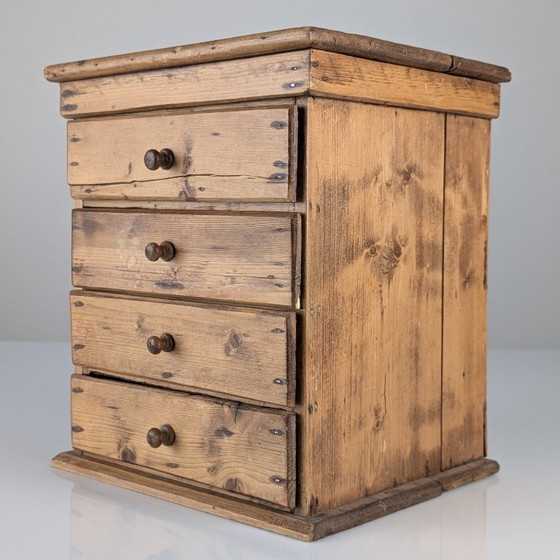 Un mobiletto artigianale di piccole dimensioni, realizzato in pino massello, risalente agli anni '40. La struttura è definita dalla sua costruzione grezza e autentica, con giunzioni a testa fissate con chiodi in ferro battuto a vista che articolano i frontali dei cassetti e i pannelli laterali.