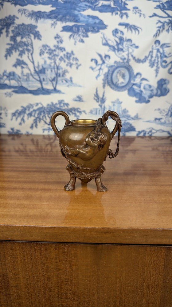 Piccolo vaso a treppiede firmato Barrias e Barbedienne in bronzo dorato Art Nouveau, fine XIX secolo