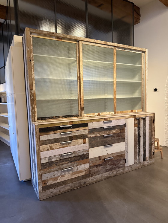 Questa credenza da cucina Piet Hein Eek è un pezzo straordinario che misura 244 x 244 x 60 cm. Realizzata in legno di recupero, presenta un esclusivo design patchwork con una combinazione di pannelli marroni, bianchi e multicolori. La sezione superiore è dotata di ante in vetro con vetro texturizzato, che offrono un'elegante superficie espositiva. La credenza è perfetta per aggiungere un tocco rustico a qualsiasi cucina o sala da pranzo.