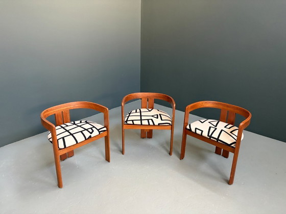 Set di 3 autentiche poltrone Pigreco in splendido noce, un'icona dell'età d'oro del modernismo italiano. Queste sedie furono progettate da Tobia Scarpa intorno al 1956-1957 e prodotte dalla leggendaria Gavina dal 1960 in poi.