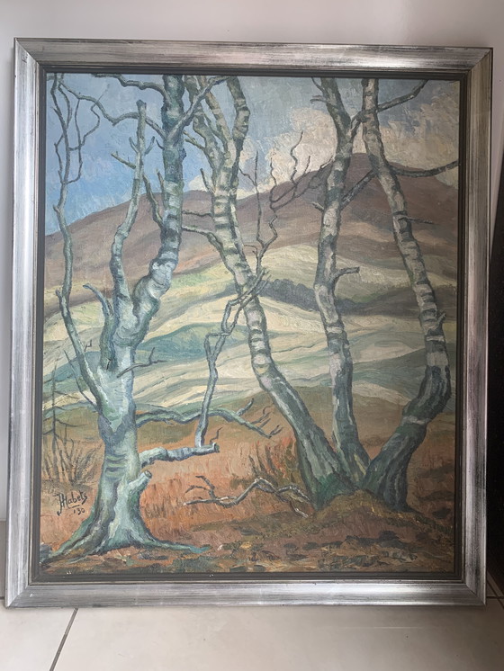 Questo squisito dipinto a olio cattura la serena bellezza di un paesaggio naturale, invitando l'osservatore in un mondo tranquillo di colori e forme. L'abile uso di blu, marroni e verdi da parte dell'artista crea una composizione armoniosa che evoca un senso di calma e riflessione.