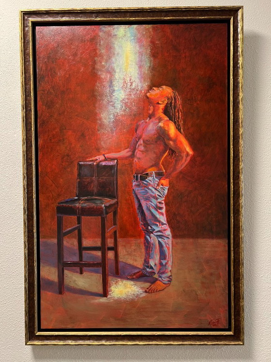 Immergiti in un mondo di emozioni vibranti con "Het Licht", un dipinto a olio originale di Henry F. Dijkhoff. Quest'opera monumentale, realizzata nel 2016, cattura un momento di introspezione e illuminazione, splendidamente incorniciata per esaltarne la presenza suggestiva.