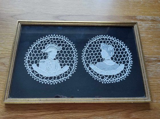 Ricamo a tombolo vintage con cornice Due pezzi raffiguranti un re e una regina del Belgio. Iscrizioni: Roi de Belges / Reine des Belges Anno: 1990 / 1995 L'articolo è in ottime condizioni. Dalle foto, sembra che ci siano delle macchie, ma non è così. Da appendere in una casa senza fumo. Dimensioni: altezza 28 cm, larghezza 40 cm Verrà spedito in plastica a bolle.